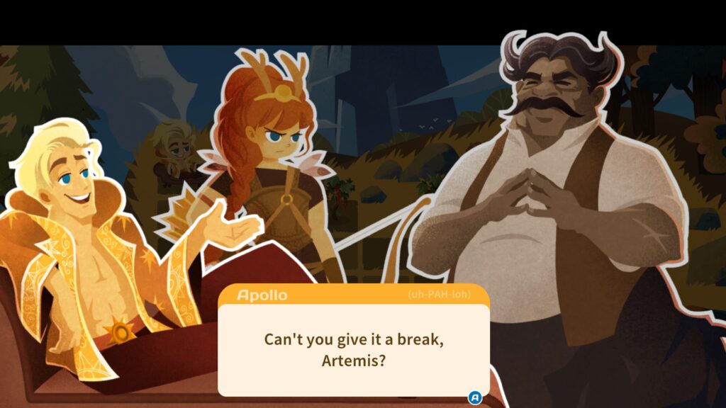 De stijl van de game voelt een beetje aan als een comic. De sfeer is licht, ontspannen, niet te flashy, maar juist mellow. Het kleurgebruik is ook heel fijn, namelijk zacht en vrij veel aardse kleuren op Ithaka. Olympus heeft wat zwaardere contrasten met bijvoorbeeld het zwart, rood oranje bij Hephaistos. Mythmatch is van Team Artichoke. Ik kan maar weinig info vinden over deze studio, maar het is in ieder geval te zien dat ze er met veel passie en plezier aan hebben gewerkt en dat ze heel trots zijn op het resultaat. Het doel was om een game neer te zetten die gemeenschap boven autoriteit plaatst en dat is zeker te merken aan de dialoog tussen de karakters. Daar draait het allemaal om gezamenlijk dragen, zelf keuzes maken en doen wat goed voelt.